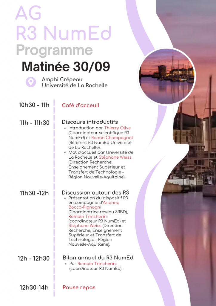 La journée du 30 septembre sera consacrée au bilan de l’année écoulée et aux présentations scientifiques des membres du réseau. Au cours de cette première journée, un prix de thèse sera remis afin de récompenser un jeune chercheur ou une jeune chercheuse du réseau. Voir modalités de candidatures : https://r3numed.labo.univ-poitiers.fr/prix-de-these-r3-numed/