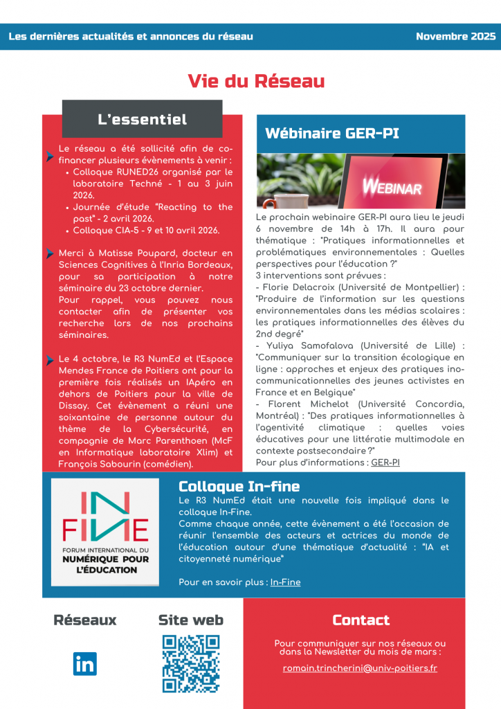 Retrouvez chaque mois la Newsletter du R3 NumEd. Au programme, des appels à communications, appels à projets, annonces de soutenance, actions du réseau…