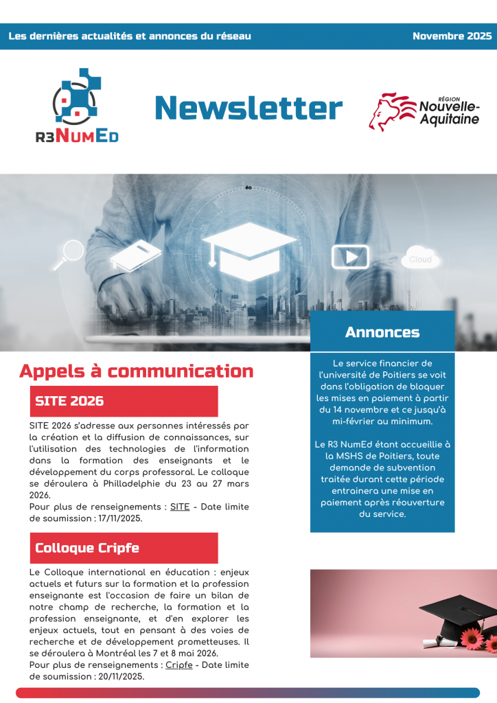 Retrouvez chaque mois la Newsletter du R3 NumEd. Au programme, des appels à communications, appels à projets, annonces de soutenance, actions du réseau…