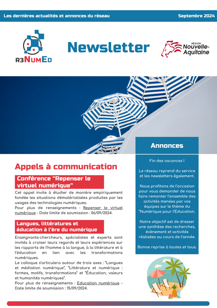Retrouvez chaque mois la Newsletter du R3 NumEd. Au programme, des appels à communications, appels à projets, annonces de soutenance, actions du réseau…